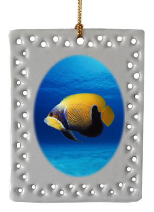 This delightful rectangle porcelain Blue Girdled Angelfish Christmas Ornament will provide a festive addition to your family celebrations. It features a Blue Girdled Angelfish on both the front and back of the ornament. Hang it on your Christmas tree or decorate anywhere around the house. This collectible ornament also makes a great gift for any animal lover. Measures about 3.5 inches high and 2.75 inches wide.