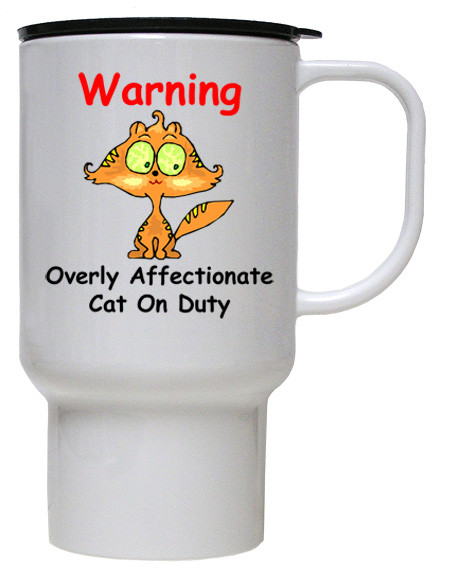 This 15 oz Travel Mug is made of a special bright white plastic polymer that makes it dishwasher and microwave safe. It features the saying "Warning Overly Affectionate Cat On Duty" on both sides. The Travel Mug is great for the home or office and makes an excellent gift item or to add to your own collection. The Travel Mug is lightweight, unbreakable and comes with a lid.