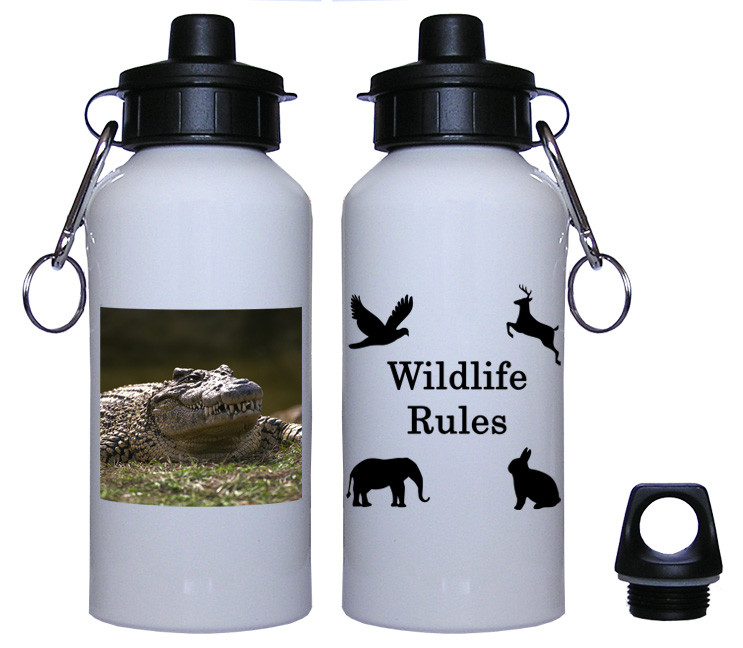 The 600ml White Aluminum Alligator Water Bottles are the perfect size to bring to sporting events, for taking beverages to school or to give as an Amphibian or Reptile gift. It features a colorful Alligator on one side with Wildlife Rules on the flipside. The water bottle comes with 2 cap fixings. One cap is a flip top stopper allowing you to drink from the bottle without removing the cap and the other screw top cap allows the bottle to be clipped to a belt and is supplied with a metal clasp. These White Aluminum Water Bottles are sturdy, lightweight and easy to clean.