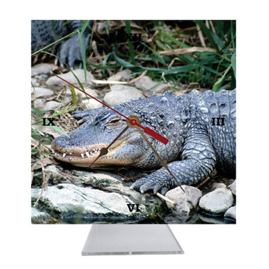 The desk clock features an amazing image of a Alligator on a 6 inch square ceramic tile.  The Alligator desk clock is attached to a clear acrylic stand allowing the clock to sit on a desk, shelf, mantle or anywhere around the house.  It makes a great gift for an animal lover!  The clock is 7 inches high and 6 inches wide.