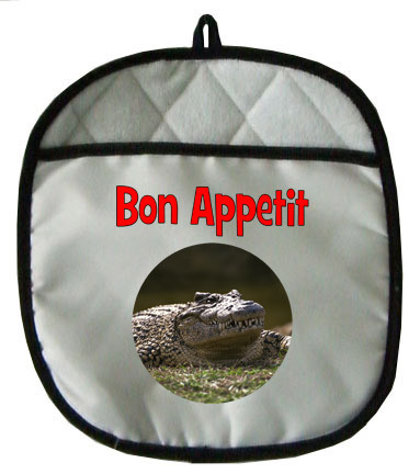 These soft, 100% terrycloth lined potholders have a heat-resistant black cotton palm, white poly top and a black cotton trim. Wonderfully decorated with a Alligator these oven mitts are a must for every household.  Overall the potholders measure about 9 by 10.5. Wash in cold water.