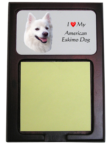 American Eskimo Dog Wooden Sticky Note Holder features a beautiful American Eskimo Dog image printed on an aluminum insert. Overall measures about 4 inches wide by 6 inches long. Complete with a 3 x 3 inch Post-it(R) Note Pad. It makes a great item for the home or office of dog lovers.