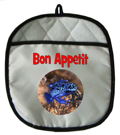 These soft, 100% terrycloth lined potholders have a heat-resistant black cotton palm, white poly top and a black cotton trim. Wonderfully decorated with a Blue Frog these oven mitts are a must for every household. Overall the potholders measure about 9 by 10.5. Wash in cold water.