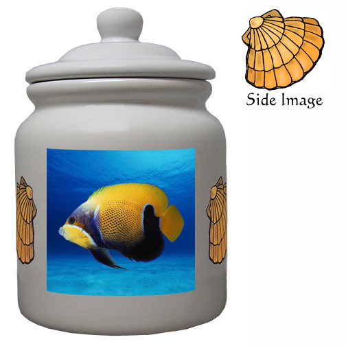 The Color Ceramic Blue Girdled Angelfish Cookie Jar is both beautiful and useful. It is a must for every animal lover and is a fantastic gift item. It measures about 6 inches wide and 9 inches high with an airtight seal inside the lid. The ceramic color cookie jar is dishwasher safe and features a color Blue Girdled Angelfish image with shells on the sides.