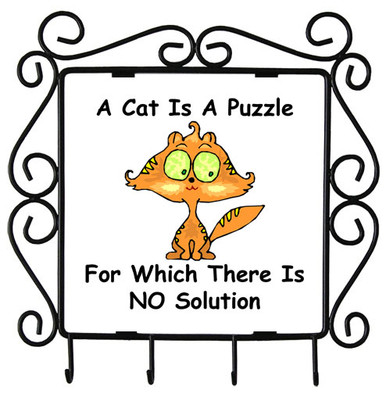 The cat Metal Key holder features the saying "A Cat Is A Puzzle For Which There Is No Solution" on a 6 inch Ceramic tile surrounded by an elegant black metal frame and four prongs to hang your keys. This item is great to hang in any room of the house or to give to as a special cat lover's gift. The metal frame measures about 8.75 wide by 9 inches high.