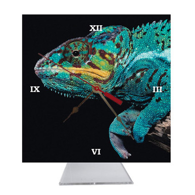 The desk clock features an amazing image of a Chameleon on a 6 inch square ceramic tile. The Chameleon desk clock is attached to a clear acrylic stand allowing the clock to sit on a desk, shelf, mantle or anywhere around the house. It makes a great gift for an animal lover! The clock is 7 inches high and 6 inches wide.
