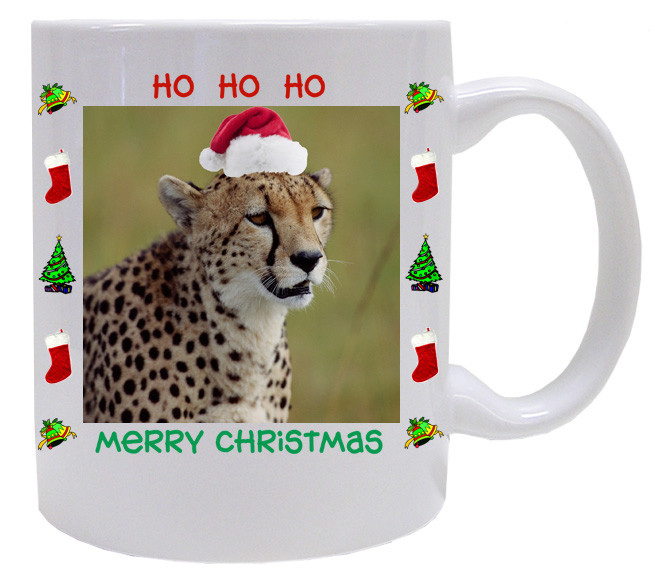 Celebrate the holiday season with this beautifully designed Cheetah Christmas Mug.  This beautiful 11 oz. ceramic Cheetah holiday coffee mug features a festive picture of a great looking Cheetah on both sides. The Cheetah Christmas coffee mug is dishwasher and microwave safe. Great as a gift item for the animal lover or to add to your own holiday collection.