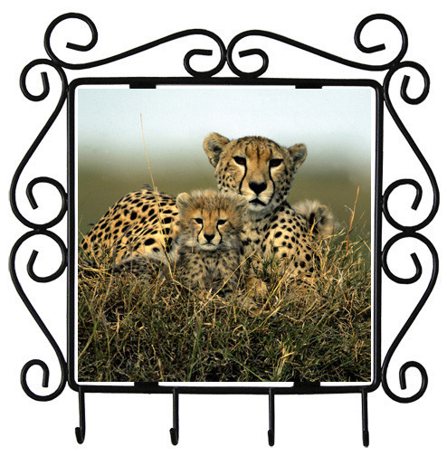 The Cheetah Metal Key holder features a 6 inch Ceramic tile surrounded by an elegant black metal frame and four prongs to hang your keys. This item is great to hang in any room of the house or to give to as a special animal lover's gift. The metal frame measures about 8.75 wide by 9 inches high.
