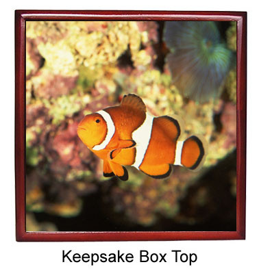 This felt lined wooden Keepsake Box gives animal lovers an excellent way to store their jewelry, personal items and favorite things. The Mahagony box features a 6 inch Clownfish decorated ceramic tile in a hinged top. Great as a Gift! Actual box dimensions are 6.75 x 6.75 inches x 2.75 inches deep. Inside area is 5 7/8 x 5 7/8 x 1 1/2 inches deep.