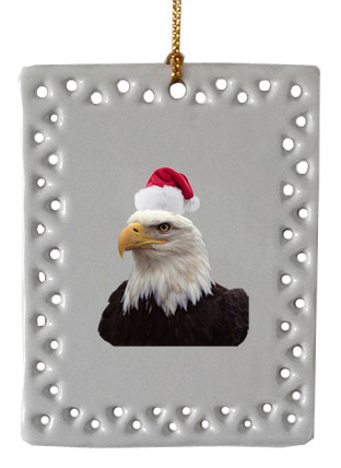 This delightful rectangle porcelain Eagle Christmas Ornament will provide a festive addition to your family celebrations. It features a Eagle on both the front and back of the ornament. Hang it on your Christmas tree or decorate anywhere around the house. This collectible ornament also makes a great gift for any bird lover. Measures about 3.5 inches high and 2.75 inches wide.