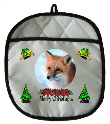 Decorate your home during the Christmas season with this soft, 100% terrycloth lined potholder. It has a heat-resistant black cotton palm, white poly top, a black cotton trim and is wonderfully adorned with a Fox, little Christmas trees and Christmas bells. Overall the potholder measure about 9 by 10.5. Wash in cold water.