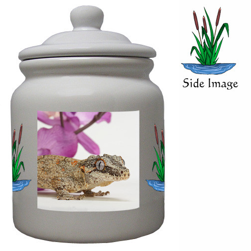 The Color Ceramic Gecko Cookie Jar is both beautiful and useful. It is a must for every animal lover and is a fantastic gift item. It measures about 6 inches wide and 9 inches high with an airtight seal inside the lid. The ceramic color cookie jar is dishwasher safe and features a color Gecko image with reeds on the sides.