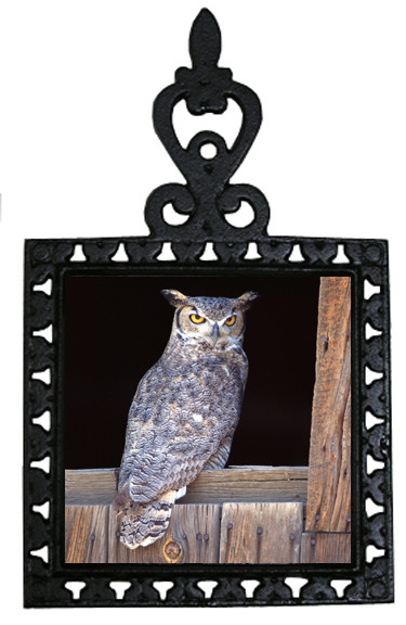This beautifully designed Great Horned Owl square trivet looks great simply hanging on a wall or use it on the kitchen table. This item features a cast iron trivet surrounding a Great Horned Owl 4 x 4 inch ceramic tile. This trivet makes a great gift item for any bird lover.