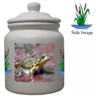 The Color Ceramic Green Frog Cookie Jar is both beautiful and useful. It is a must for every animal lover and is a fantastic gift item. It measures about 6 inches wide and 9 inches high with an airtight seal inside the lid. The ceramic color cookie jar is dishwasher safe and features a color Green Frog image with reeds on the sides.