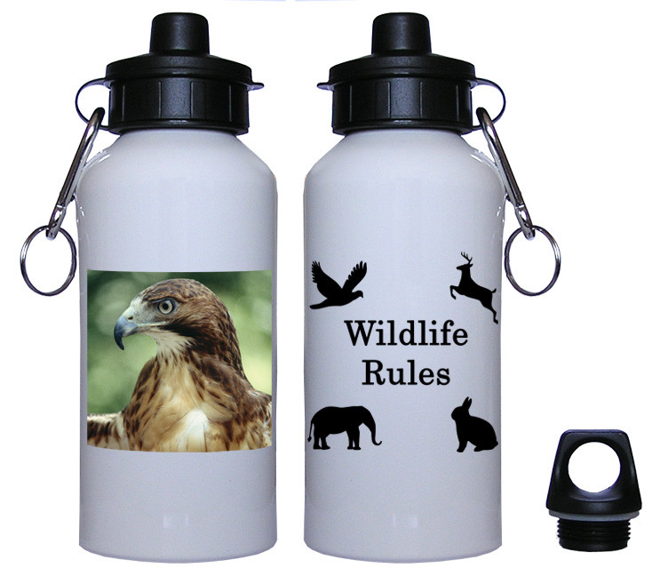 The 600ml White Aluminum Hawk Water Bottles are the perfect size to bring to sporting events, for taking beverages to school or to give as a bird gift. It features a colorful Hawk on one side with Wildlife Rules on the flipside. The water bottle comes with 2 cap fixings. One cap is a flip top stopper allowing you to drink from the bottle without removing the cap and the other screw top cap allows the bottle to be clipped to a belt and is supplied with a metal clasp. These White Aluminum Water Bottles are sturdy, lightweight and easy to clean.