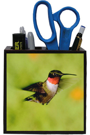The wooden pencil holder features a colorful Hummighbird image and will make a great addition to your home or office.  It has two big compartments with room enough to hold pens, pencils, fat markers, scissors, letter openers, etc. (accessories not included).  The Hummighbird wooden pencil holder measures about 4.75 inches tall by 4.75 inches wide and has a satin rosewood finish.   It also makes a great gift for the Hummighbird lover.