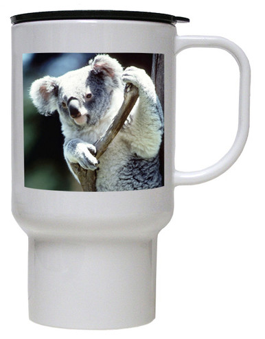 This 15 oz Travel Mug is made of a special bright white plastic polymer that makes it dishwasher and microwave safe. It features a marvelous Koala Bear on both sides! The Koala Bear Travel Mug is lightweight, unbreakable and comes with a lid.