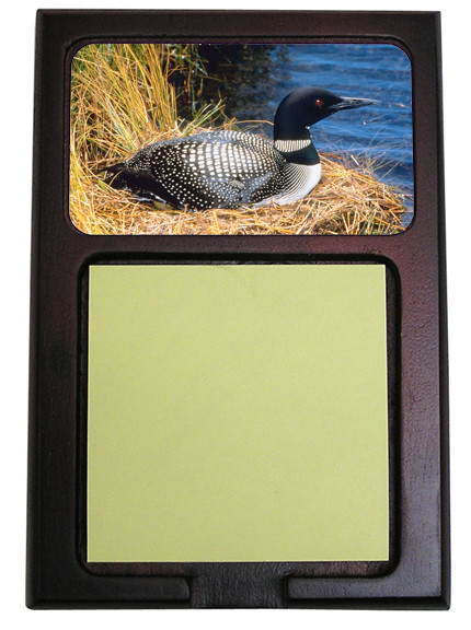 Loon Wooden Sticky Note Holder features a beautiful Loon image printed on an aluminum insert. Overall measures about 4 inches wide by 6 inches long. Complete with a 3 x 3 inch Post-it(R) Note Pad. It makes a great item for the home or office of animal lovers.