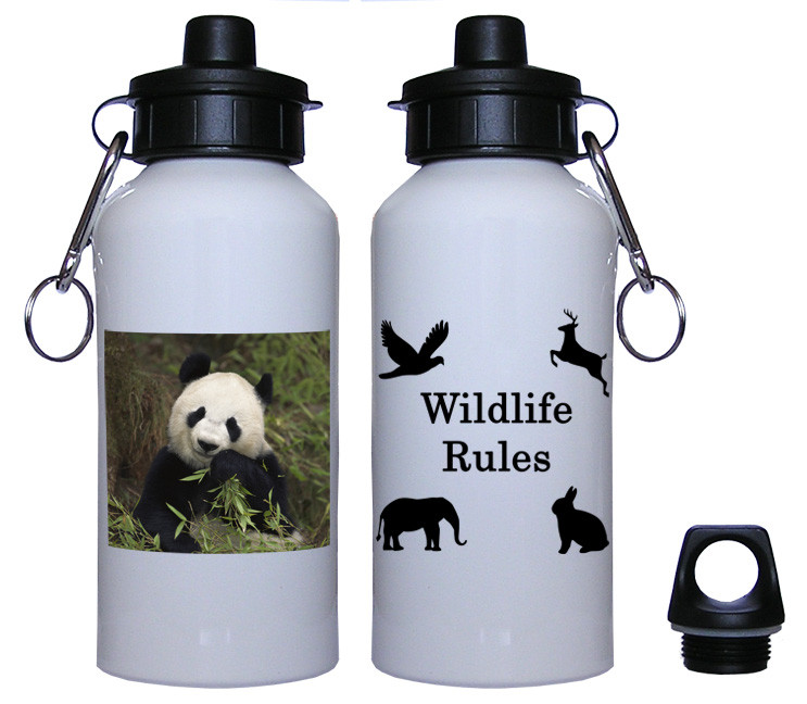 The 600ml White Aluminum Panda Bear Water Bottles are the perfect size to bring to sporting events, for taking beverages to school or to give as a bear gift. It features a colorful Panda Bear on one side with Wildlife Rules on the flipside. The water bottle comes with 2 cap fixings. One cap is a flip top stopper allowing you to drink from the bottle without removing the cap and the other screw top cap allows the bottle to be clipped to a belt and is supplied with a metal clasp. These White Aluminum Water Bottles are sturdy, lightweight and easy to clean.