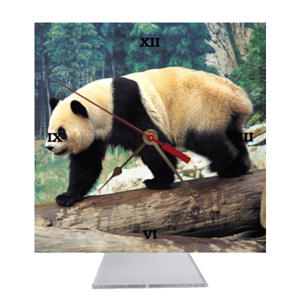 The desk clock features an amazing image of a Panda Bear on a 6 inch square ceramic tile.  The Panda Bear desk clock is attached to a clear acrylic stand allowing the clock to sit on a desk, shelf, mantle or anywhere around the house.  It makes a great gift for a bear lover!  The clock is 7 inches high and 6 inches wide.
