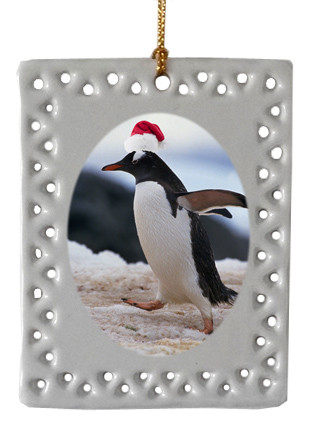 This delightful rectangle porcelain Penguin Christmas Ornament will provide a festive addition to your family celebrations. It features a Penguin on both the front and back of the ornament. Hang it on your Christmas tree or decorate anywhere around the house. This collectible ornament also makes a great gift for any bird lover. Measures about 3.5 inches high and 2.75 inches wide.