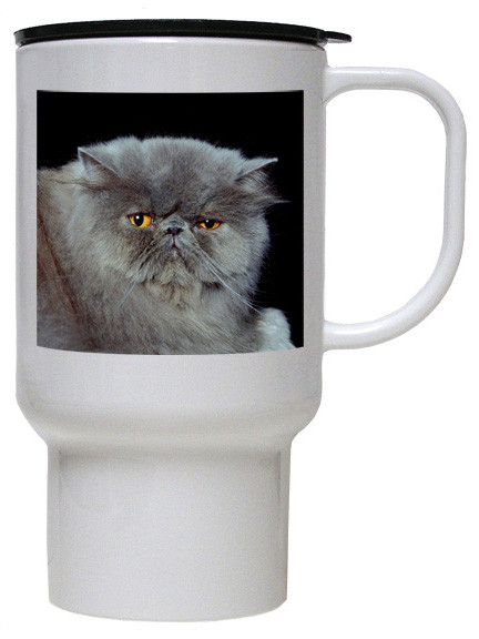 This 15 oz Travel Mug is made of a special bright white plastic polymer that makes it dishwasher and microwave safe. It features a beautiful Persian Cat picture on one face with an I Love Cats saying on the flip side. The I Love Cats Travel Mug is lightweight, unbreakable and comes with a lid.