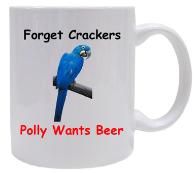 An 11 oz. ceramic coffee mug with the saying "Forget Crackers Polly Wants Beer" on both sides. This coffee mug is dishwasher and microwave safe. The mug is great for the home or office and makes an excellent gift item or to add to your own collection.