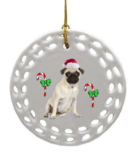 This delightful round porcelain Pug Christmas Ornament will provide a festive addition to your family celebrations. It features a Pug on the face and a wondrous Christmas tree on the back. Hang the ornament on your Christmas tree or decorate anywhere around the house. This collectible ornament also makes a great gift for any dog lover. Measures about 3 inches in diameter and 1/8 inch thick