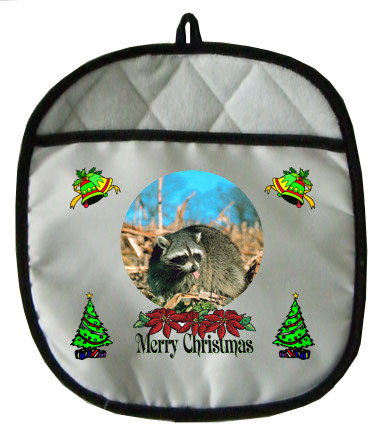 Decorate your home during the Christmas season with this soft, 100% terrycloth lined potholder. It has a heat-resistant black cotton palm, white poly top, a black cotton trim and is wonderfully adorned with a Raccoon, little Christmas trees and Christmas bells. Overall the potholder measure about 9 by 10.5. Wash in cold water.