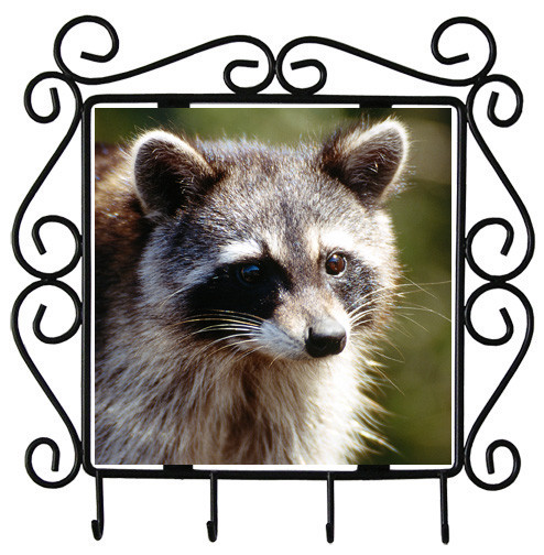 The Raccoon Metal Key holder features a 6 inch Ceramic tile surrounded by an elegant black metal frame and four prongs to hang your keys. This item is great to hang in any room of the house or to give to as a special animal lover's gift. The metal frame measures about 8.75 wide by 9 inches high.