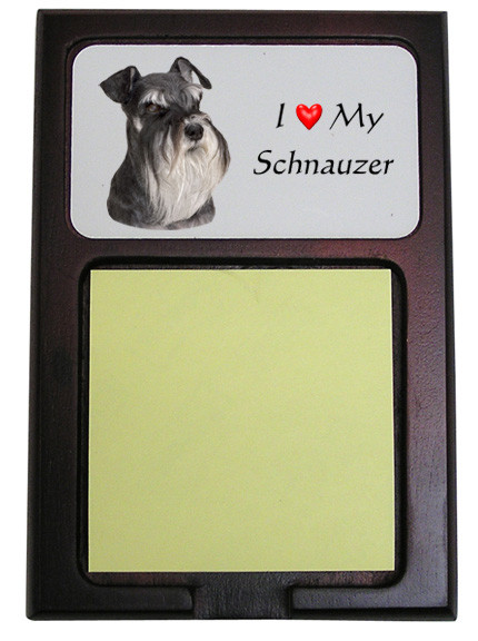 Schnauzer Wooden Sticky Note Holder features a beautiful Schnauzer image printed on an aluminum insert. Overall measures about 4 inches wide by 6 inches long. Complete with a 3 x 3 inch Post-it(R) Note Pad. It makes a great item for the home or office of dog lovers.