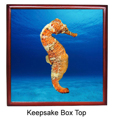 This felt lined wooden Keepsake Box gives animal lovers an excellent way to store their jewelry, personal items and favorite things. The Mahagony box features a 6 inch Seahorse decorated ceramic tile in a hinged top. Great as a Gift! Actual box dimensions are 6.75 x 6.75 inches x 2.75 inches deep. Inside area is 5 7/8 x 5 7/8 x 1 1/2 inches deep.