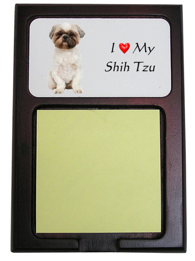 Shih Tzu Wooden Sticky Note Holder features a beautiful Shih Tzu image printed on an aluminum insert. Overall measures about 4 inches wide by 6 inches long. Complete with a 3 x 3 inch Post-it(R) Note Pad. It makes a great item for the home or office of dog lovers.