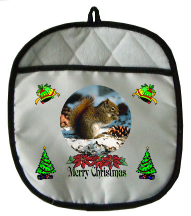 Decorate your home during the Christmas season with this soft, 100% terrycloth lined potholder. It has a heat-resistant black cotton palm, white poly top, a black cotton trim and is wonderfully adorned with a Squirrel, little Christmas trees and Christmas bells. Overall the potholder measure about 9 by 10.5. Wash in cold water.