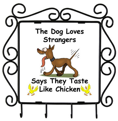 The dog Metal Key holder features the saying "The Dog Loves Strangers Says They Taste LIke Chicken" on a 6 inch Ceramic tile surrounded by an elegant black metal frame and four prongs to hang your keys. This item is great to hang in any room of the house or to give to as a special dog lover's gift. The metal frame measures about 8.75 wide by 9 inches high.