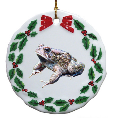 Celebrate Christmas with the beautiful Toad wreath decorated porcelain ornament. Colorful green holly and a red bow surround a fantastic Toad image on both sides of this collectible Christmas Ornament. The Holly Wreath Ornament makes a great holiday gift or simply hang on your tree. This flat porcelain ornament measures about 3.5 inches wide.