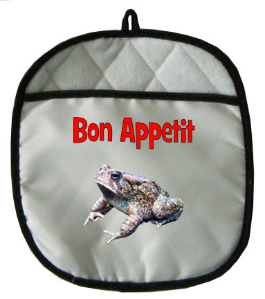 These soft, 100% terrycloth lined potholders have a heat-resistant black cotton palm, white poly top and a black cotton trim. Wonderfully decorated with a Toad these oven mitts are a must for every household. Overall the potholders measure about 9 by 10.5. Wash in cold water.