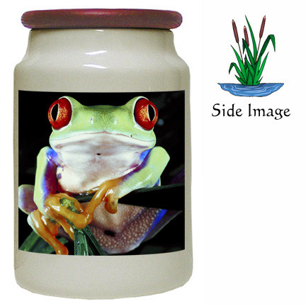 The Canister jar is a smaller version of our very popular Cookie Jar. These Tree Frog Canister jars are the perfect holder for coffee, tea or sugar and will compliment any kitchen. Great as a gift for any animal lover, this Tree Frog Canister jar is just the right size measuring about 6 inches tall and 3.5 inches wide. The white ceramic canister jars are sealed tightly with a mahogany finished wood lid for the perfect touch.
