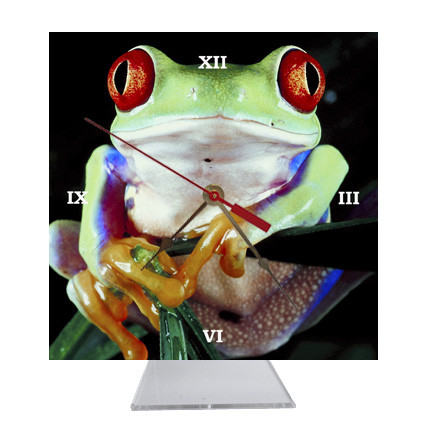 The desk clock features an amazing image of a Tree Frog on a 6 inch square ceramic tile.  The Tree Frog desk clock is attached to a clear acrylic stand allowing the clock to sit on a desk, shelf, mantle or anywhere around the house.  It makes a great gift for an animal lover!  The clock is 7 inches high and 6 inches wide.