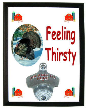 This Turkey Feeling Thirsty Wall Mounted Bottle Opener plaque come with a black edge finish and is keyholed on the back for easy mounting. It features an amazing Turkey image, a fun saying and a retro-look Starr X Open Bottle Here mounted bottle opener. This beautiful plaque is a must for your home, recreation room, wet bar, bedroom, kitchen and makes a great gift item. The plaque is a 5/8 inch thick MDF and measures 7 inches by 9 inches.
