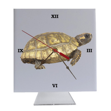 The desk clock features an amazing image of a Turtle on a 6 inch square ceramic tile. The Turtle desk clock is attached to a clear acrylic stand allowing the clock to sit on a desk, shelf, mantle or anywhere around the house. It makes a great gift for an animal lover! The clock is 7 inches high and 6 inches wide.