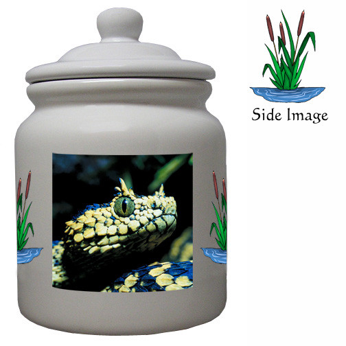 The Color Ceramic Viper Snake Cookie Jar is both beautiful and useful. It is a must for every animal lover and is a fantastic gift item. It measures about 6 inches wide and 9 inches high with an airtight seal inside the lid. The ceramic color cookie jar is dishwasher safe and features a color Viper Snake image with reeds on the sides.